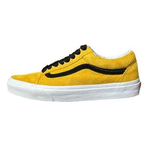 Classic Vans Old Skool sneakers in a bold yellow suede with black side stripe. Features a durable suede upper, cushioned insole, lace-up closure, and Vans’ signature waffle rubber sole.