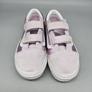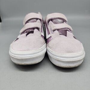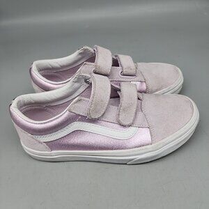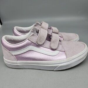 The VANS Old Skool V Metallic Lavender Kids Shoes are stylish skate sneakers designed for youth in size 3. With a hook & loop closure for easy wear, these sneakers feature a cushioned and comfortable design suitable for walking, school, and skateboarding. Made with leather upper material and standard shoe width, these sneakers come in a trendy metallic lavender color perfect for young girls who love outdoor and sports activities. The VANS brand ensures quality and durability, making these shoes a great choice for active kids.