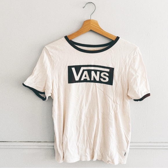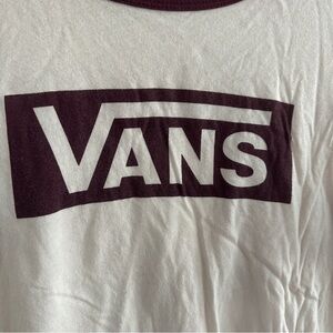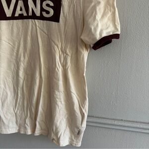 Cream and burgundy ringer tee with Vans logo across chest. A bit of pilling characteristic of washing a tee shirt.