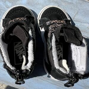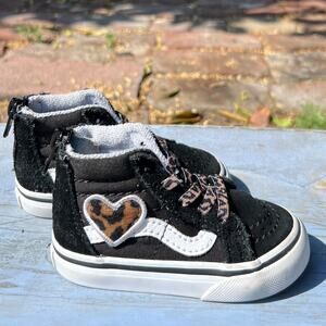 Super cute Vans SK8-Hi Leopard Heart toddler shoes! These black high tops are in size 4. Perfect for your little one to make a fashion statement. Get them now!