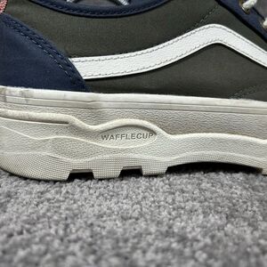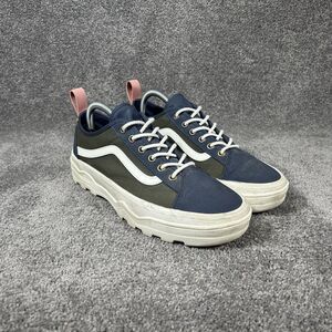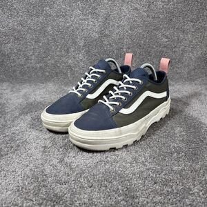 The VANS Sentry Old Skool WC Womens 10 Mens 8.5 Blue Green Canvas Skate Shoes are a stylish and comfortable option for anyone looking for a versatile athletic shoe. Featuring a lace-up closure and cushioned insole, these shoes are perfect for skateboarding, hiking, or everyday casual wear. The blue and green colorblock design with logo accents adds a colorful and trendy touch to the classic sneaker style. With a rubber outsole for maximum traction and a low-top shoe shaft style, these VANS Old Skool shoes are a must-have for anyone looking for a blend of comfort and style in their footwear.