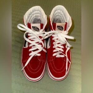 Stylish and comfortable, these Vans womens/mens high-top sneakers in vibrant red are perfect for everyday adventures. Featuring durable construction and classic design, they offer both style and support. Some marks but all over good condition. Unisex.