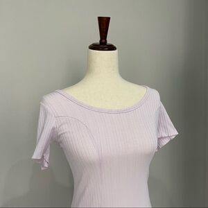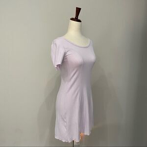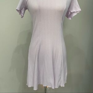The perfect dress for summer. 96% polyester, 4% elastane variegated rib flare dress with short sleeves, a scoop neck, and lettuce edging at the sleeves and hem. Color is lavender fog. Worn a few times but great condition.