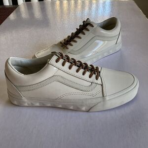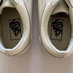 VANS Women’s Old Skool White Patent Leather Sneakers Size 7 in excellent used condition. No rips or tears very minor dirt stains from normal use. Original white flat shoe laces replaced with round higher quality shoe laces.