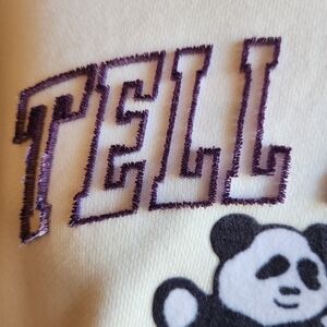 Purple lettering is raised and fuzzy