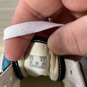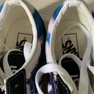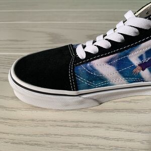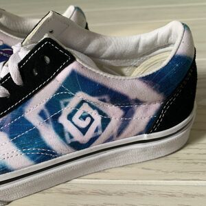 These VANS X Karl Jacobs Old Skool sneakers in size 5 US feature a tie-dye pattern with Karl's comic-inspired design. They are low-top lace-up sneakers made of multicolor canvas with a rubber outsole. The shoes are suitable for activewear, casual, and workwear occasions, and are great for summer, fall, and spring seasons. The sneakers are part of the VANS Old Skool product line, perfect for fans of anime, colorful designs, and comics.
