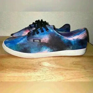 Men's or women's casual shoes or sneakers. Made by VANS off the Wall. Blue, pink - multi-colored. Looks like night sky and stars. Canvas uppers.