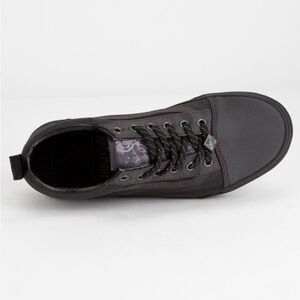 Vans x Harry Potter Deathly Hallows Old Skool shoes. This season, Vans and Harry Potter collaborate to conjure up a magical collection of footwear for witches, wizards, and Muggles alike. And no matter which of the Hogwarts houses the Sorting Hat decides upon - be it Gryffindor, Slytherin, Ravenclaw, or Hufflepuff - you can display your loyalty in genuine "Off The Wall" style. Shimmery synthetic upper. Features a Deathly Hallows charm as depicted in the Harry Potter series on front lace. Deathly Hallows symbol on back heel. Printed tongue with a clear plastic cover. Wand print on the outsole. Elastic laces and pull tabs at the heel, allowing for an easy on-and-off fit. Clear plastic eyelets. Padded collar. Rubber waffle outsole. Imported.