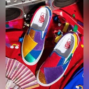 Vans x Pride Classic Slip-On Shoes. The Pride Classic Slip-On incorporates a kaleidoscope of color with bold materials and a Vans twist on an iconic rainbow print. Made with low profile uppers featuring a patchwork of bright colors and glitter, this classic slip-on shoe also includes supportive padded collars, elastic side accents, and signature rubber waffle outsoles. Pride collection made to support LGBTQ+ creative expression globally. Imported.