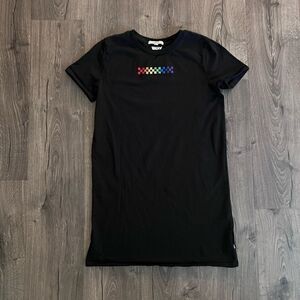 Vans x Pride T-Shirt Dress. Embroidery on front and back. Checkerboard rainbow pattern on front. Vans logo on back under collar. Ribbed crew neckline. Short sleeves. Pride collection made to support LGBTQ+ creative expression globally. 100% Cotton. Machine wash. Imported.