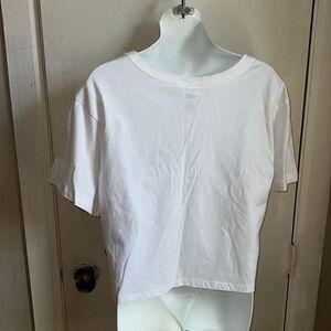 Crewneck, Short sleeves, Jersey construction. Machine washable cotton. Crop fit.