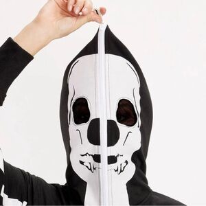 This sweet skeleton onesie zips up all the way to the top of your head. We've got every bone covered, from skull to toes. This skeleton onesie conveniently has a few vented holes in the head, which you can see and breathe through, which means you can stay anonymous all night if you want to- and also alive.