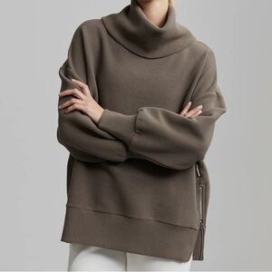 With its bellowed sleeves, side zip details, dropped shoulders, deep cuffs, and relaxed roll neck, this oversized sweatshirt effortlessly combines comfort and style.