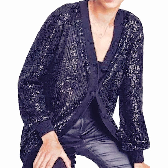 VARSITY Black Sequin Sweater Cardigan Sweater Knit Covered Buttons Relaxed Fit