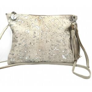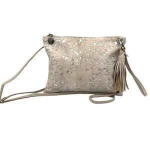 Stand out with this handcrafted VASH handbag, made in South Africa using ethically sourced genuine cowhide and leather. Features a striking acid-washed silver finish on a neutral cream base for a rustic western look with a modern edge.