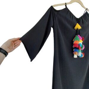 This VASNA cold shoulder shift dress has 3/4 sleeves with a slight bell shape. It features fun, colorful tassels and pom-poms in yellow, green, blue, red, pink, black, brown, orange, gray, purple, burgundy, and white! The bodice of the dress is lined; the sleeves are not lined.
