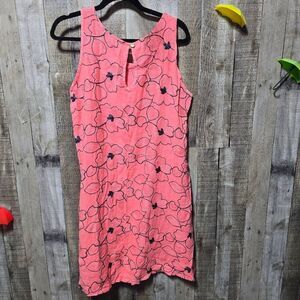 Details: Embroidered floral design, keyhole button back, scoop neck, lightweight, sheath, about knee length