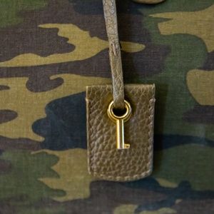 - Hanging leather tag with key charm.