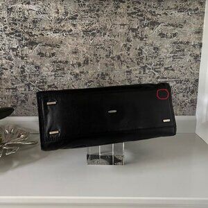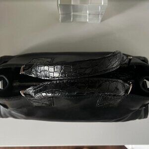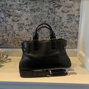 From the ultra-luxury handbag designer V. Bruce Hoeksema, this VBH limited edition "VAGABOND" satchel reflects the simple contemporary styling that put VBH on the map. The exterior body is crafted in BLACK leather trimmed with gorgeous crocodile, including the comfortable rolled handles and subtle brand symbol at base of bag. Detachable shoulder/cross body strap which makes this bag very versatile. Silver hardware. Secure zip closure. Fully lined in suede that is affixed with the designer's brand placard indicating model and edition number.