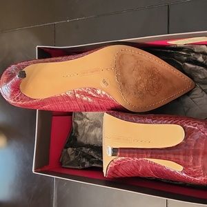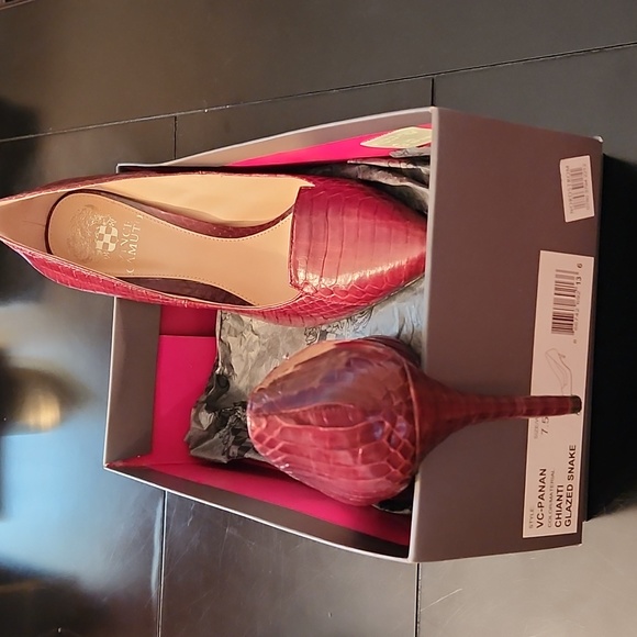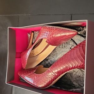 These are Vince Camuto Snake skinned pumps. The heal height is about 3.3-4inches. My shoes have been worn and Well Maintained! no scratched heals and no scuffed toes.