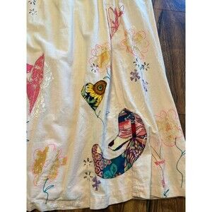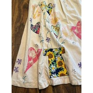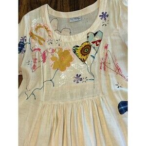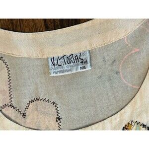 This fantastic V.C. Torias hand painted dress is a work of art! So whimsical and fun for summer! I believe it has a large area of color transfer (hard to see in the photos) from some of the red art (turned parts of the dress pink) and it has discoloration under the arms. It also has a gray stain on the back bottom hem. I have not attempted to correct any of those things, I will leave that to the new owner. See pics for details and measurements.