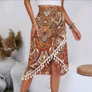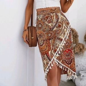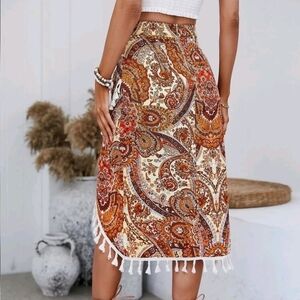 VCAY Paisley Print Tassel Trim Wrap Hem Skirt for women size xs