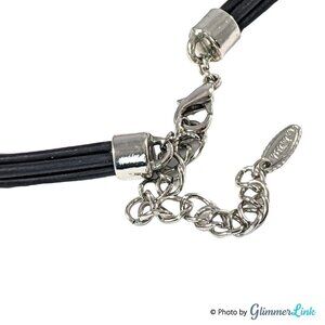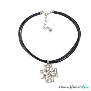 Multi strand pendant necklace featuring a cross pendant accented with black and red rhinestone crystals. The pendant hangs from five black rubber cord strands with silver tone hardware.