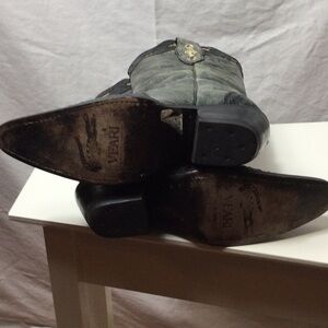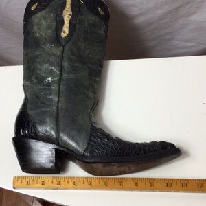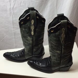 Elegant black and green leather & alligator cowboy boots by VEARI. Mexican sized 25 B which is a 8 in women’s. Pointed toe with slanted stacked heel.