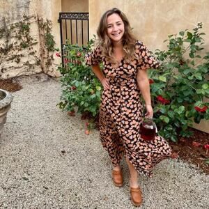 VEDA Montana Dress Floral Print Flutter Sleeve Button Front Maxi Orange Black XL