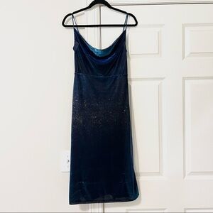 Blue polyester (85% Polyester, 15% Lurex). Sheath. Cowl neckline. Sleeveless.