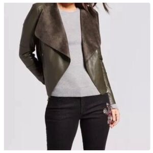 Crafted of a lightweight faux-leather this topper jacket flaunts an effortless drape.