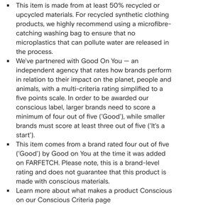 This item is made from at least 50% recycled or upcycled materials. For recycled synthetic clothing products, we highly recommend using a microfibre-catching washing bag to ensure that no microplastics that can pollute water are released in the process.