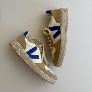 Veja V-10 low-top sneakers in classic white with blue and beige suede accents