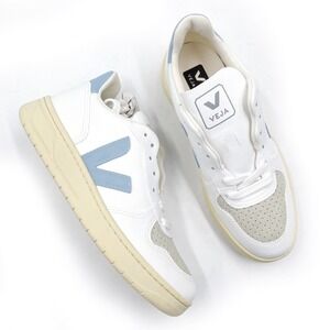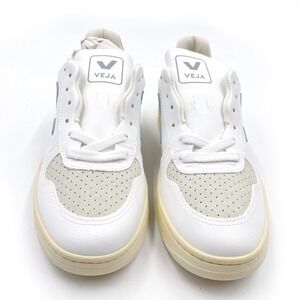 VEJA V-10 Sneakers White Steel Butter Blue Low Top Sz 5 US Women's New with Box. Classic low top sneakers by VEJA, offering style and comfort for everyday wear. These sneakers feature a clean white upper accented by a cool blue signature "V" logo on the side, a matching blue heel, and a contrasting beige rubber sole. The front of the shoe is designed with a perforated detailing adding a touch of texture and breathability. The VEJA branding is subtly placed on the tongue and heel, enhancing its iconic look. Department: Women Color: White Model: VEJA V-10 Upper Material: Leather Features: Breathable, Comfort, Cushioned, Lightweight, Low Top Style: Sneaker Type: Athletic Keywords: VEJA, sneakers, low top, white sneakers, blue sneakers, casual shoes, women's sneakers, fashion sneakers, designer sneakers, VEJA shoes, rubber sole, walking shoes