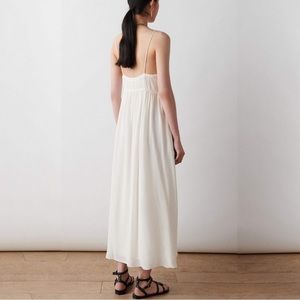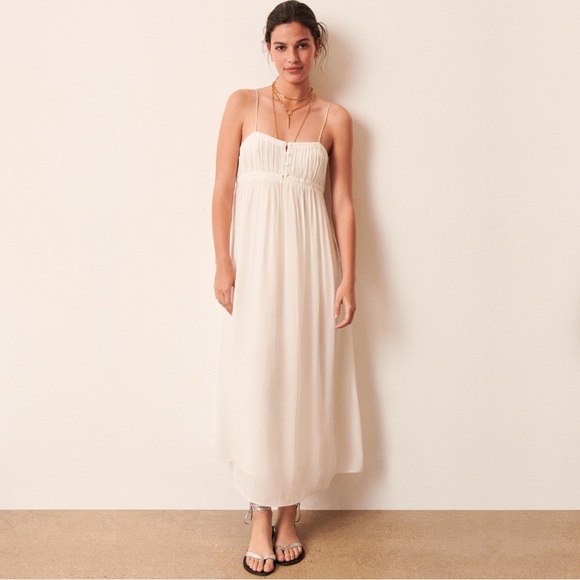 Streamlined and feminine style describe this ba&sh VELMA dress best. The long dress with narrow braided straps is fitted through the bust with a small front button placket and a side full skirt. It's cut in textured fabric with a small checkered effect. A breezy dress that's perfect for summers on the shore.