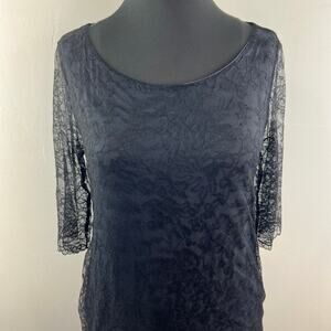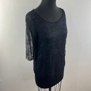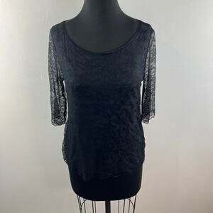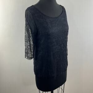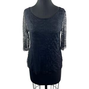VELVET Black Lace Overlay Top Blouse 3/4 Round Neck Pullover Size M Medium
