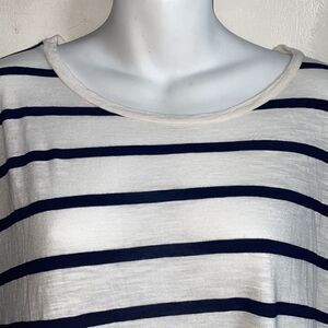 Washable Cotton, modal, and rayon,blend in a white with Navy stripe pattern, long sleeve, crew neck, split back. Excellent condition. Size Medium, measures 25” from armpit to armpit and 22” from top of shoulder to bottom hem.