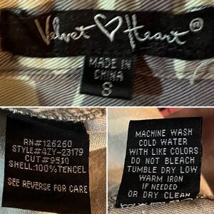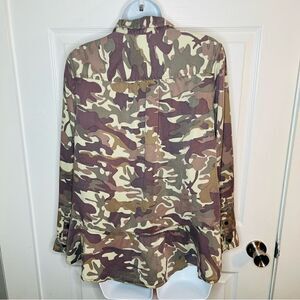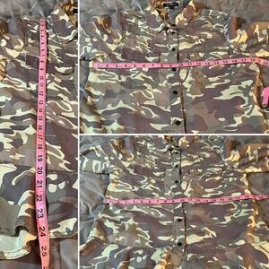 VELVET HEART Camo Button Down Shirt Bottom Ruffle Green Size Small. Long sleeve top. Collared. Peplum ruffle. Button down. Lightweight. Unlined. Great with a tshirt under or by itself. Gently used Good Preowned Condition.