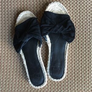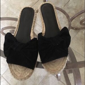 Velvet Bow Top Espadrille Slide Sandals! You can see in the photo some fuzz sticking to the velvet I couldn’t see in person so I can’t guarantee you might not see something I missed. These didn’t fit me right so they should be like new although I did try to wear once. As- is non returnable. Please feel free to ask questions.