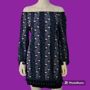 VELZERA Floral Embroidered Tassel Fringe Off Shoulder Bell Sleeve Hippie Tunic