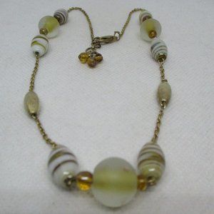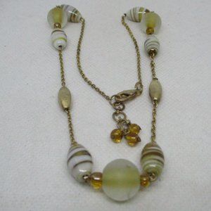 Never worn vintage single strand swirled Venetian glass beads, frosted glass beads honey-colored glass beads, matt finish gold tone beaded matt finish gold tone metal beaded necklace with a lobster claw clasp, extension chain with 3 honey-colored glass Venetian dangle end beads.