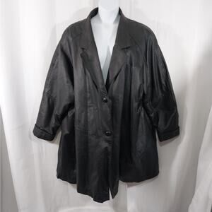 From Venezia comes this awesome black genuine leather coat, jacket, overcoat! Featuring gorgeous, high quality leather, a full button front, and hidden front pockets! Shoulder pads, and it's fully lined in black poly satin! A deliciously sleek, classy piece! Size 3X, rarely worn! Excellent! Superb EUC Condition! **ABSOLUTELY GUARANTEED CONDITION: EUC MINTY-EXCELLENT TO LIKE-NEW, by Lily @HauteClub!***
