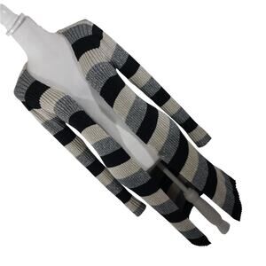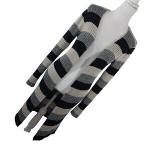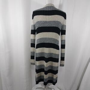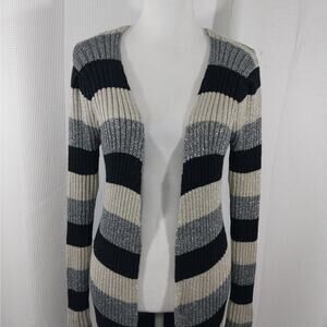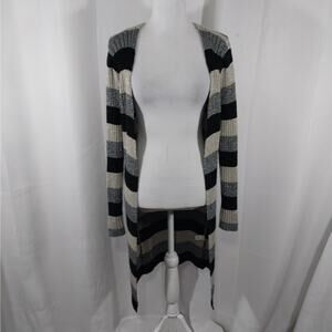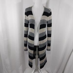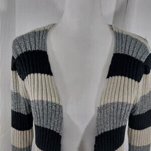 From Venus is this absolutely adorable duster length sweater, in black, gray and silver metallic! Big bold stripes, it features a ribbed knit, long sleeves, and easy versatility! An open cardigan, Size S, worn once! Excellent! Superb EUC Condition! **ABSOLUTELY GUARANTEED CONDITION: EUC MINTY-EXCELLENT TO LIKE-NEW, by Lily @HauteClub!***