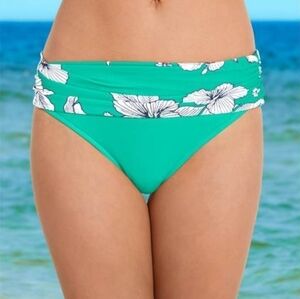 Gathered at the sides, band tucks under the sides of your bottom and buttons for security