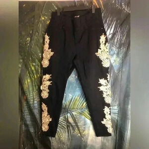 Elegant black pants with intricate gold embroidery. Perfect for stylish occasions.