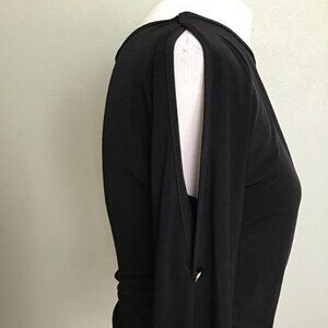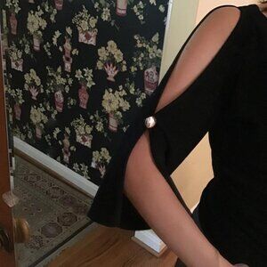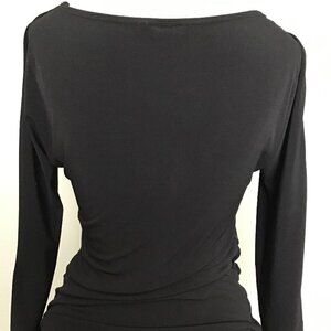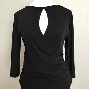 Black Faux-wrap Top Size S 3/4 length, slit sleeves Measures 18" minimum pit to pit (faux wrap adjusts to larger size) no visible flaws