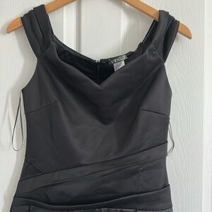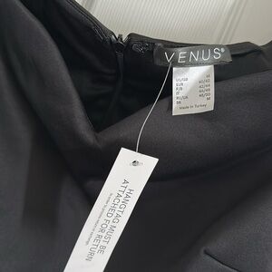 This stunning black sheath dress by VENUS features a ruched bodice and a sweetheart neckline, perfect for a cocktail night out. The sleeveless design and ruffled hem add a touch of elegance and playfulness to this classic midi dress.