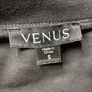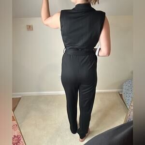 This sophisticated black jumpsuit from VENUS features a wrap-style V-neckline and a fitted waist with a tie detail, offering a tailored yet comfortable fit. The full-length tapered legs and soft, flowing fabric create a classic silhouette perfect for both professional and casual occasions.