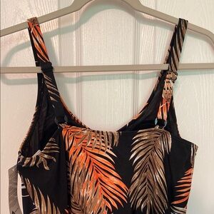 Dive into style with the VENUS Swim Tank Top, featuring a relaxed fit and a striking black and orange color palette. Adjustable straps, sewn in bra pads. The vibrant palm frond pattern adds a touch of tropical flair to your swimwear collection.