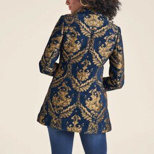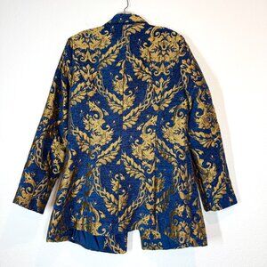VENUS Blue Gold Brocade Blazer Jacket Longline Statement Coat Jacquard Sz 14 XL